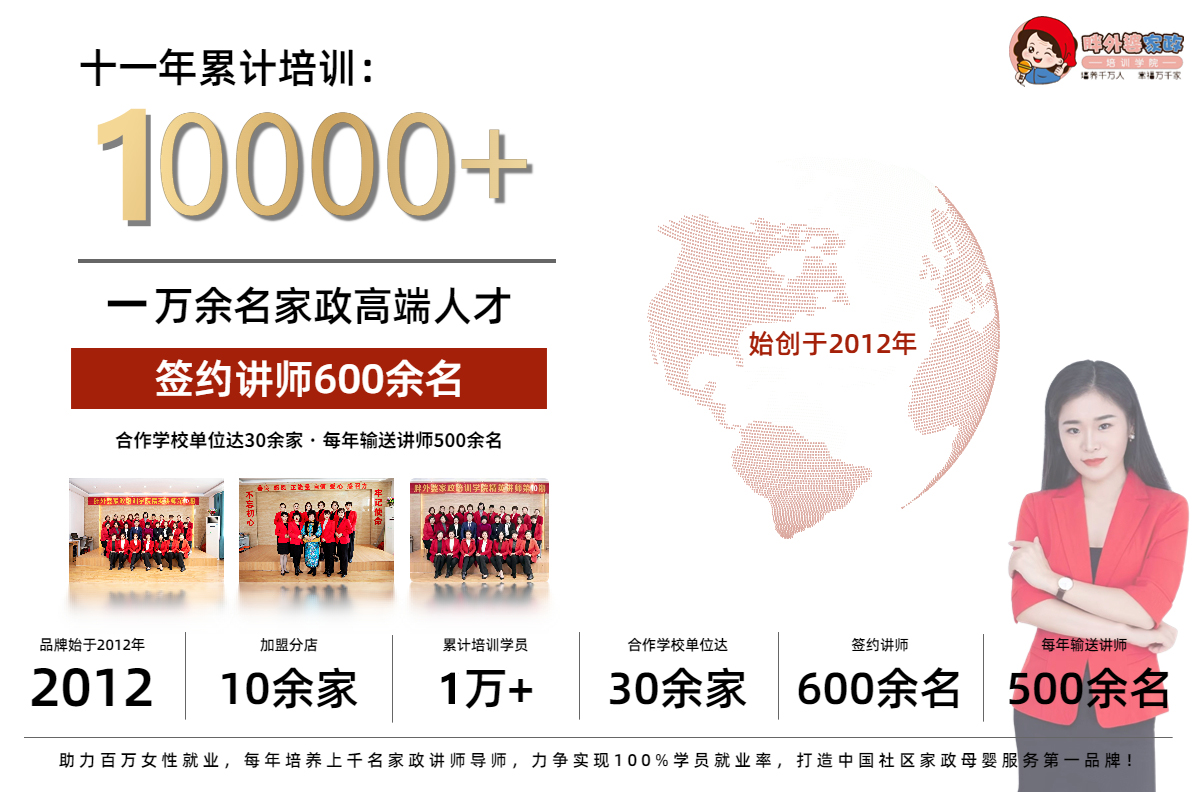 经过十余年的发展,从原本的小规模经营,逐步发展成为拥有签约讲师600余名,10多家分公司,年输送人才500名,累计培养10000位家政高端人才的大型家政培训机构,并与30多家学校单位达成人员输送合作关系,有效解决学员就业“痛点”。